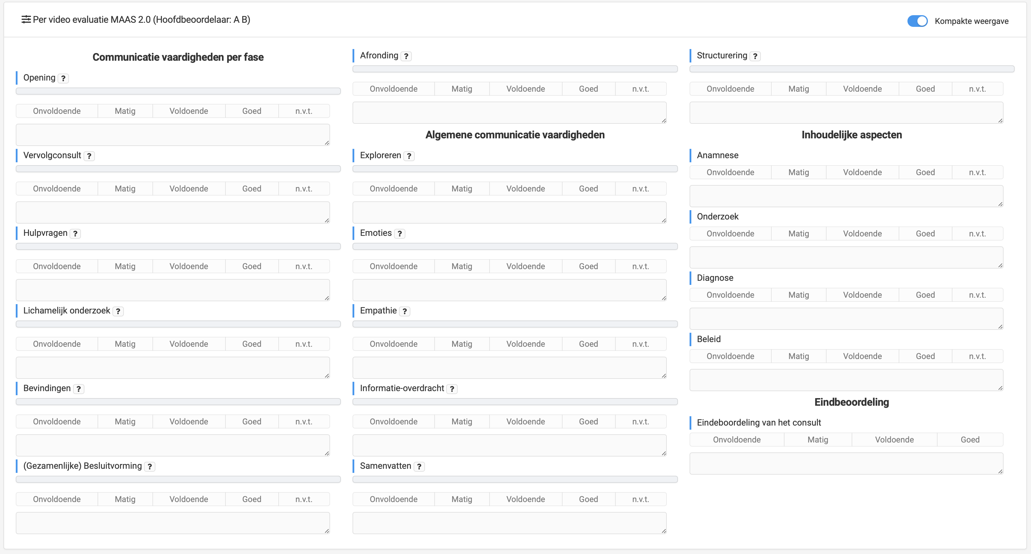 The complete set of skills typically has a scientifically underpinned methodology within Videolab. Most of our customers in Belgium and the Netherlands leverage the MAAS-2.0, which is the most renowned framework for assessing doctor-patient consultations. MAAS-2.0 is developed by the University of Maastricht and has been widely used since 1992. MAAS-2.0 is supported out-of-the-box within Videolab.