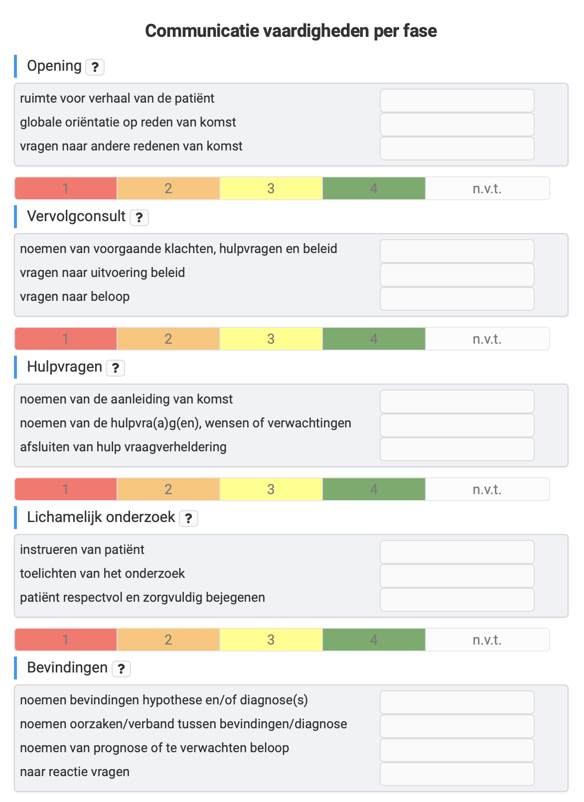 Some customers have opted for a slightly modified version of the MAAS-2.0 or a completely different form, such as the OPTION 5 Form used by the Dutch Federation of Cancer Patient Organisations (NFK). Videolab comes with an advanced form-builder with custom reporting functionalities that can be tuned towards your own training and assessment methodology.